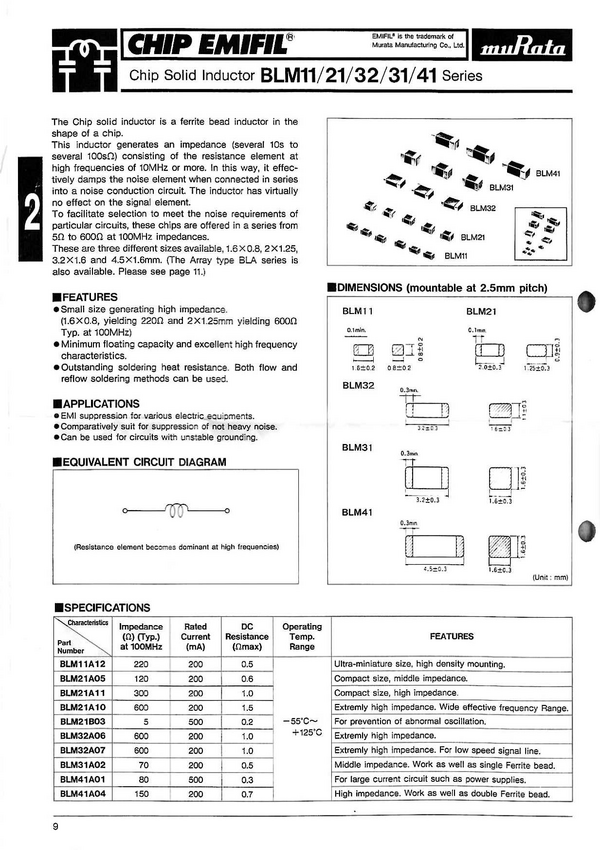 Filtr; koralik; ferrytowy; dławik; 100MHz: 80Ohm; 0,30Ohm; 500mA; 1,6x4,5x1,6mm; 1806; SMD; MURATA; BLM41A01PTM003-03; RoHS; opakowanie/100szt