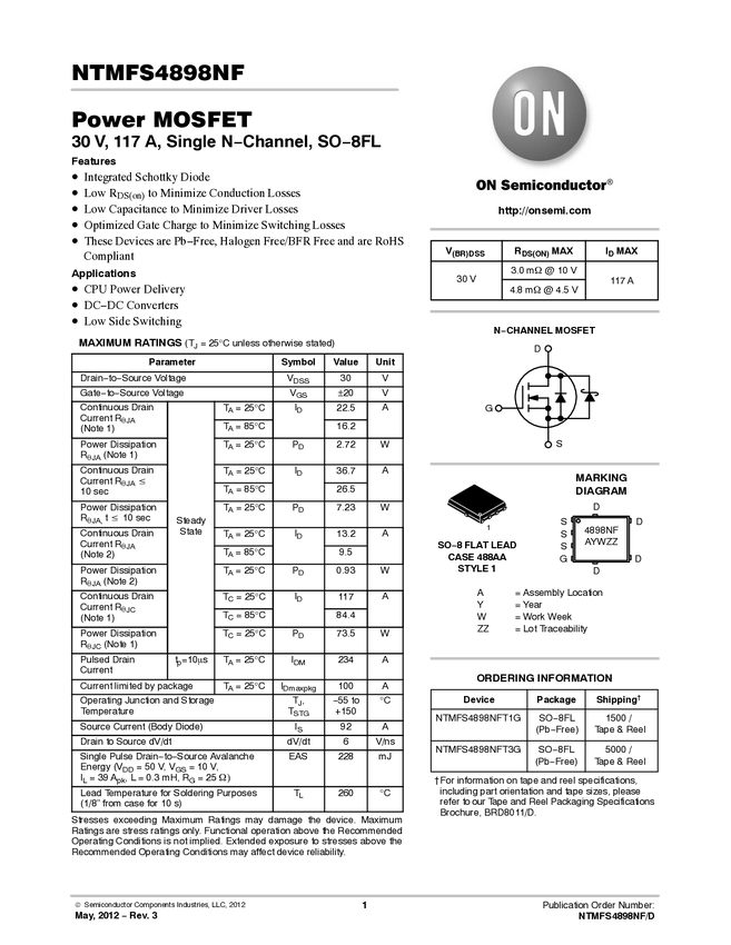 Power MOSFET 30V 117A 3 mOhm Single N-Channel SO-8FL FETky