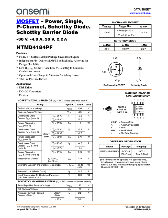 FETKY™ P-Channel Enhancement-Mode Power MOSFET and Schottky Diode Dual SO-8 Package