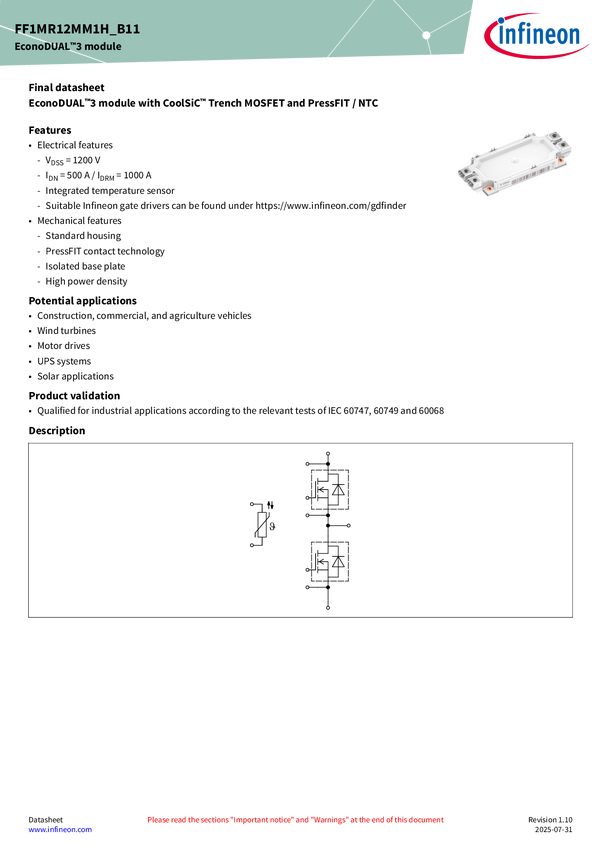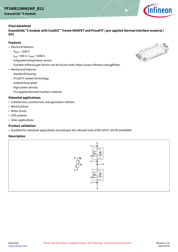 CoolSiC™ MOSFET half-bridge module 1200 V EconoDUAL™ 3 CoolSiC™ MOSFET half-bridge module 1200 V, 1.4 mΩ with enhanced generation 1, integrated NTC temperature sensor, PressFIT contact technology, and pre-applied Thermal Interface Material. Also available with wave structure on the back side of the base plate for direct liquid cooling (FF1MR12MM1HWB11).