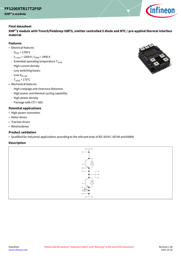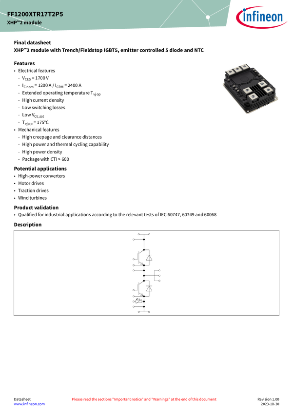1700 V, 1200 A dual IGBT module XHP™ 2 1700 V, 1200 A dual IGBT module with .XT interconnection technology, TRENCHSTOP™ IGBT5 and Thermal Interface Material for high reliability and robustness, combined with system availability and long lifetime for high power traction and wind applications.