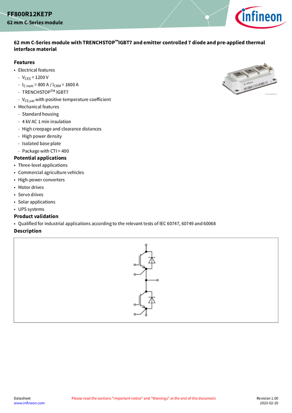 1200 V, 800 A dual IGBT module with pre-applied thermal interface material 62 mm 1200 V, 800 A dual low sat & fast trench IGBT module with TRENCHSTOP™ IGBT7 and emitter controlled 7 diode.