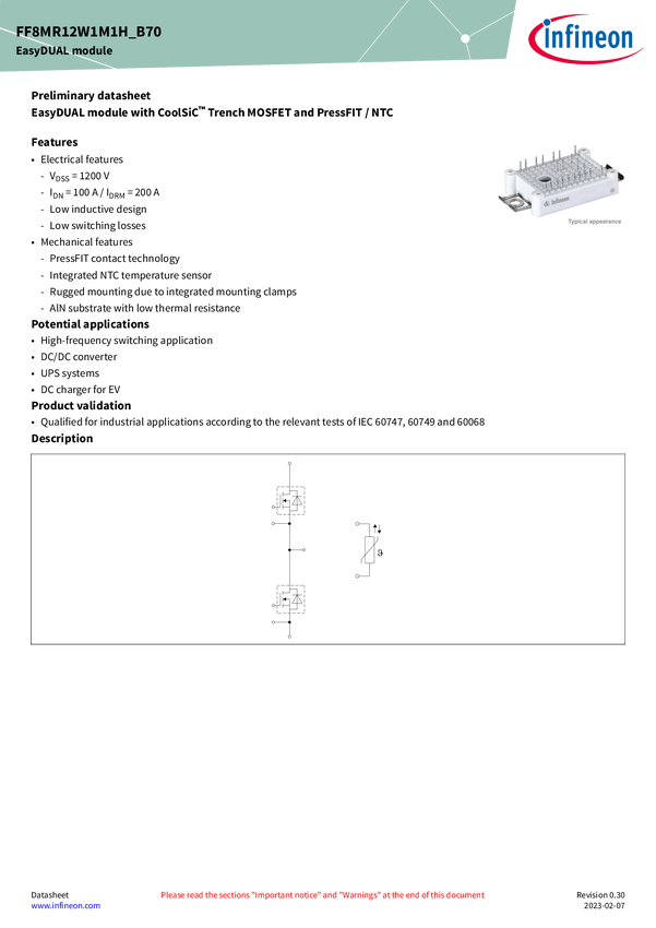 CoolSiC™ MOSFET half-bridge module 1200 V EasyDUAL™ 2B CoolSiC™ MOSFET half-bridge module 1200 V, 8 mΩ G1 with integrated NTC temperature sensor and PressFIT Contact Technology.