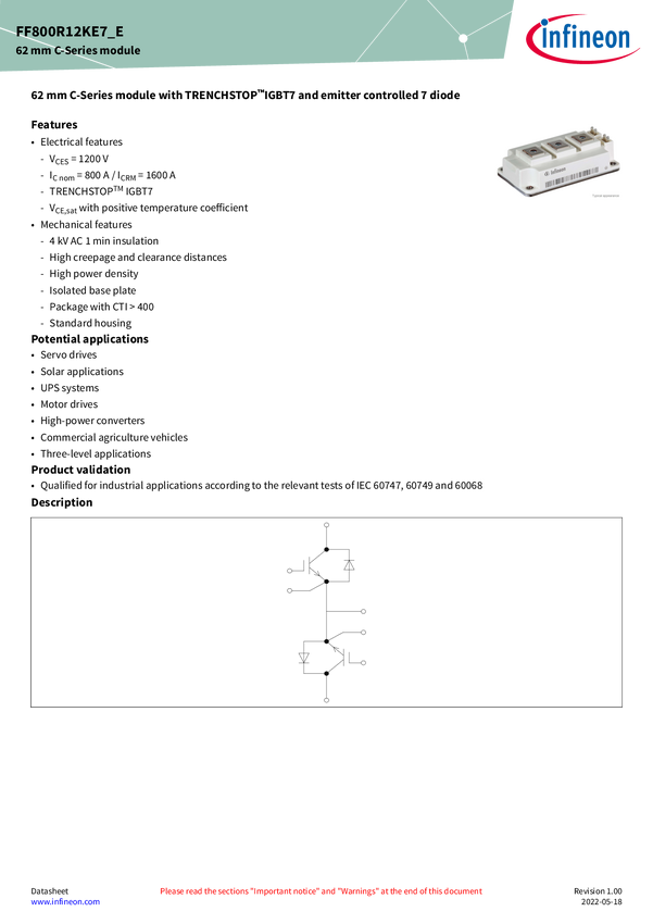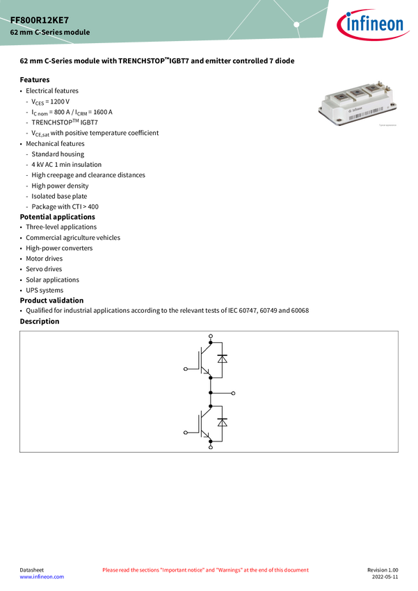 1200 V, 800 A dual IGBT module 62 mm 1200 V, 800 A dual low sat & fast trench IGBT module with TRENCHSTOP™ IGBT7 and emitter controlled 7 diode.