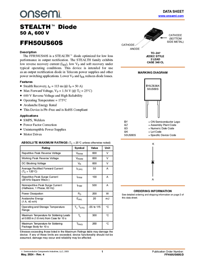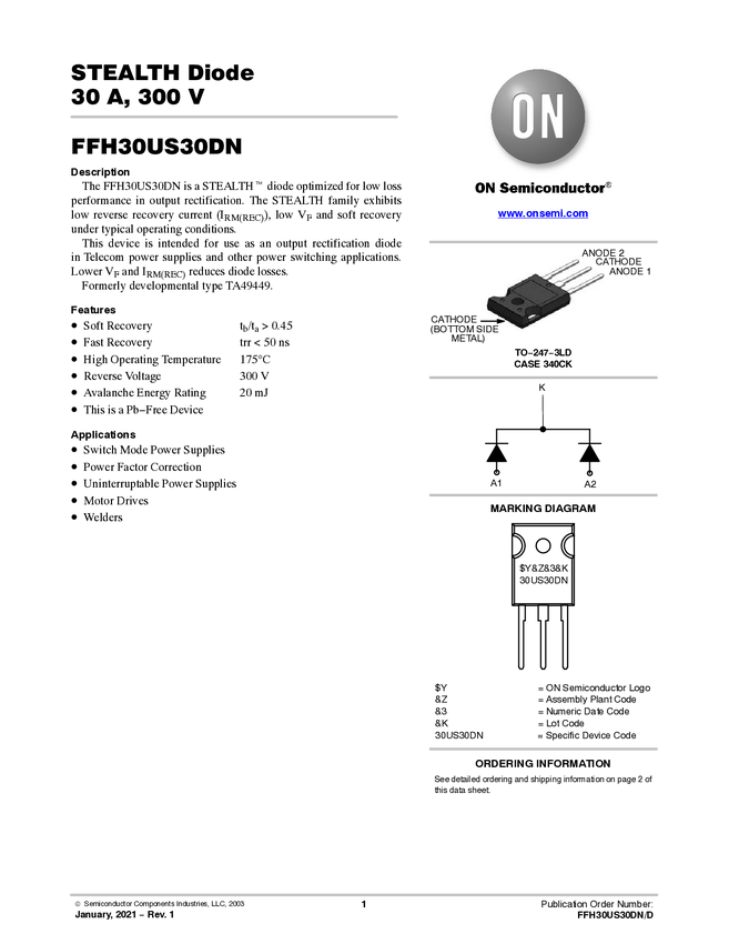 Rectifier, 30A, 600V, 2.6V, TO-247(2-lead) STEALTH II