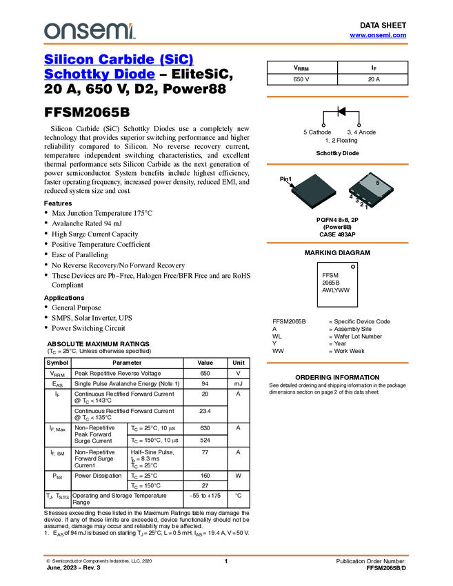 Silicon Carbide (SiC) Schottky Diode – EliteSiC, 20 A, 650 V, D2, Power88
