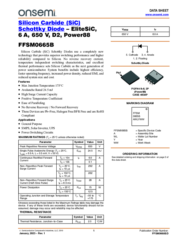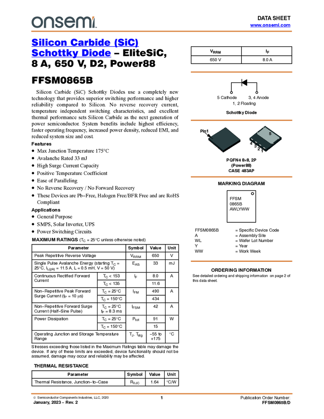 Silicon Carbide (SiC) Schottky Diode – EliteSiC, 8 A, 650 V, D1, Power88