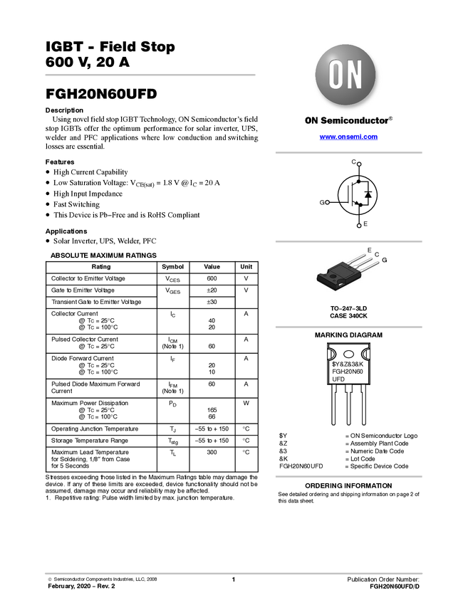 650V, 20A, 2.2V, TO-247High Speed Field Stop IGBT