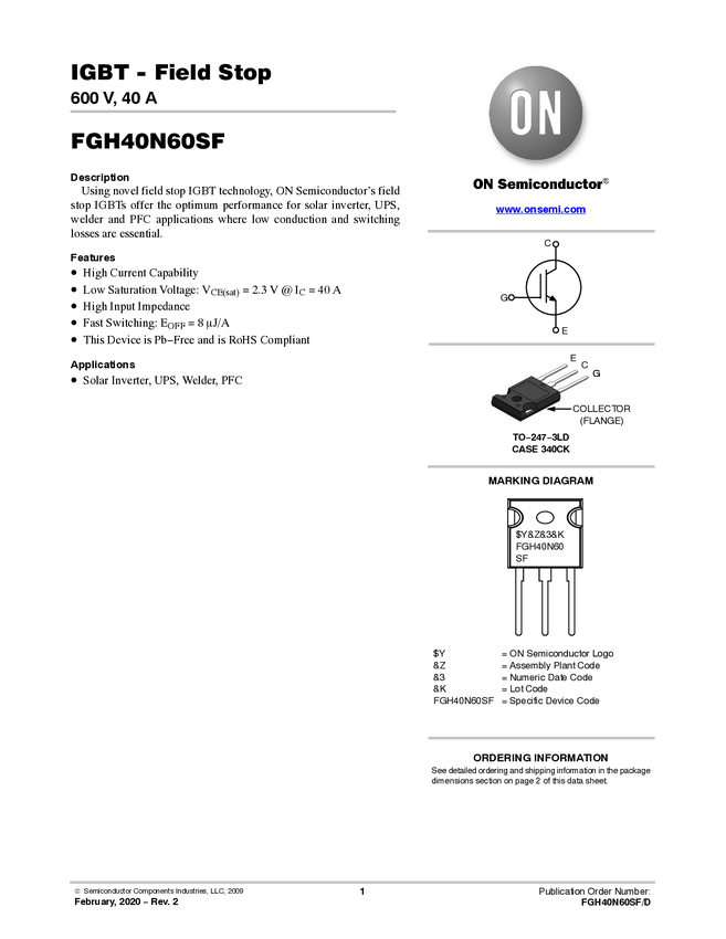 600V, 40A, 2.3V, TO-247High Speed Field Stop IGBT