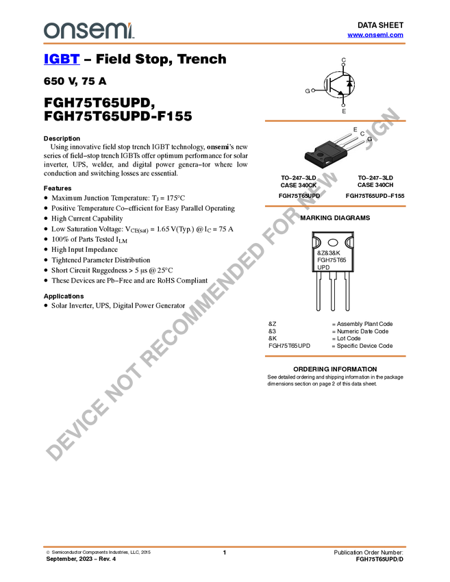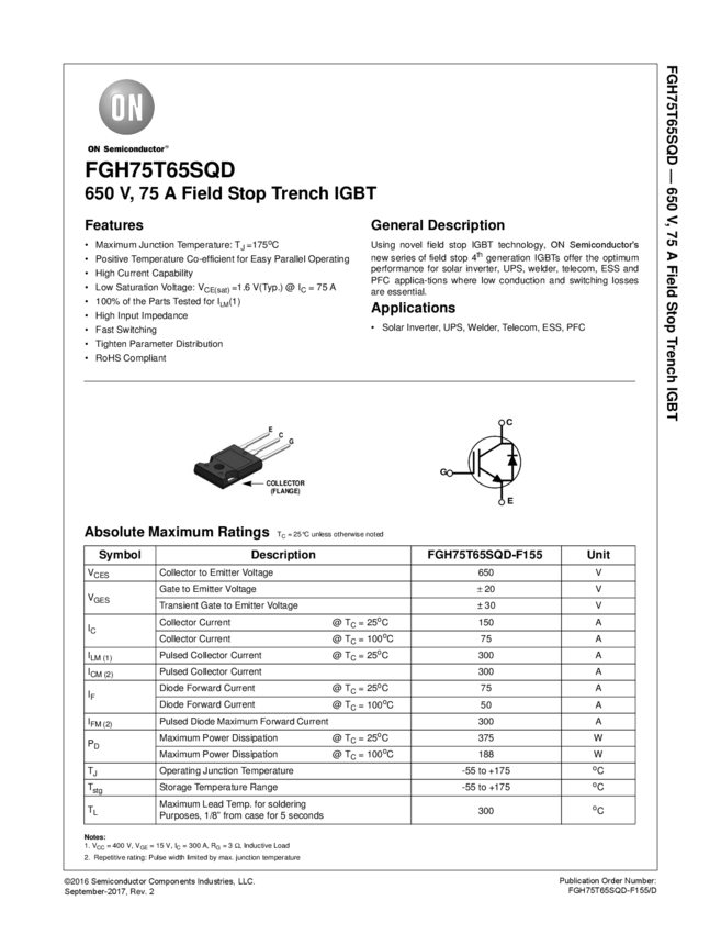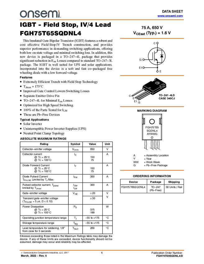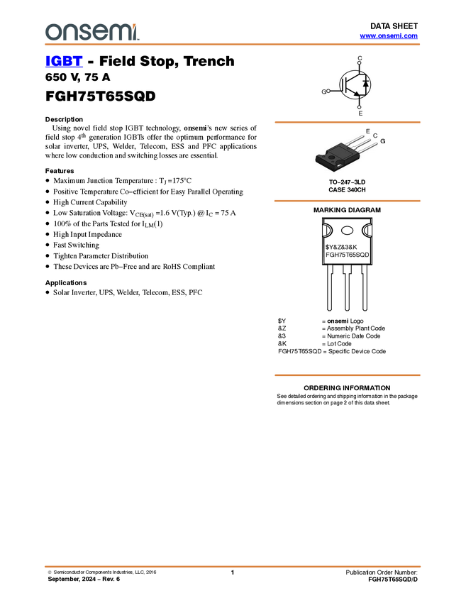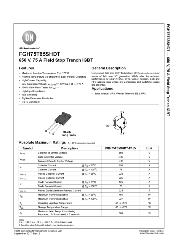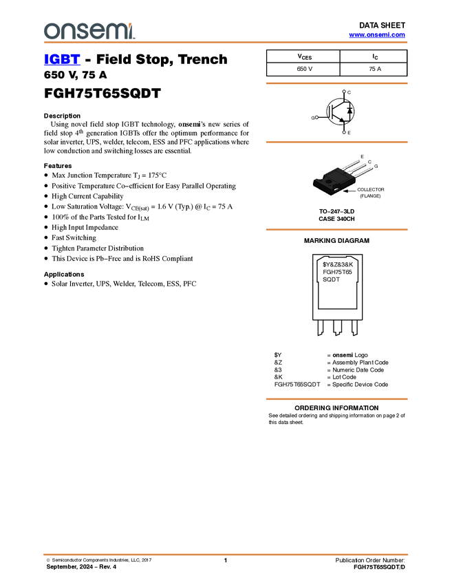 650V, 75A, 1.69V, TO-247Field Stop IGBT