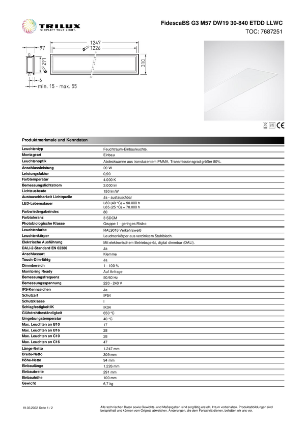 Trilux FidescaBSG3 #7687251 Lampa LED do wilgotnych pomieszczeń LED 20 W biały biały