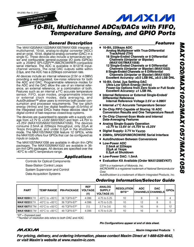 MAX1220, MAX1257, MAX1258 12-Bit, Multichannel ADCs/DACs with FIFO, Temperature Sensing, and GPIO Ports