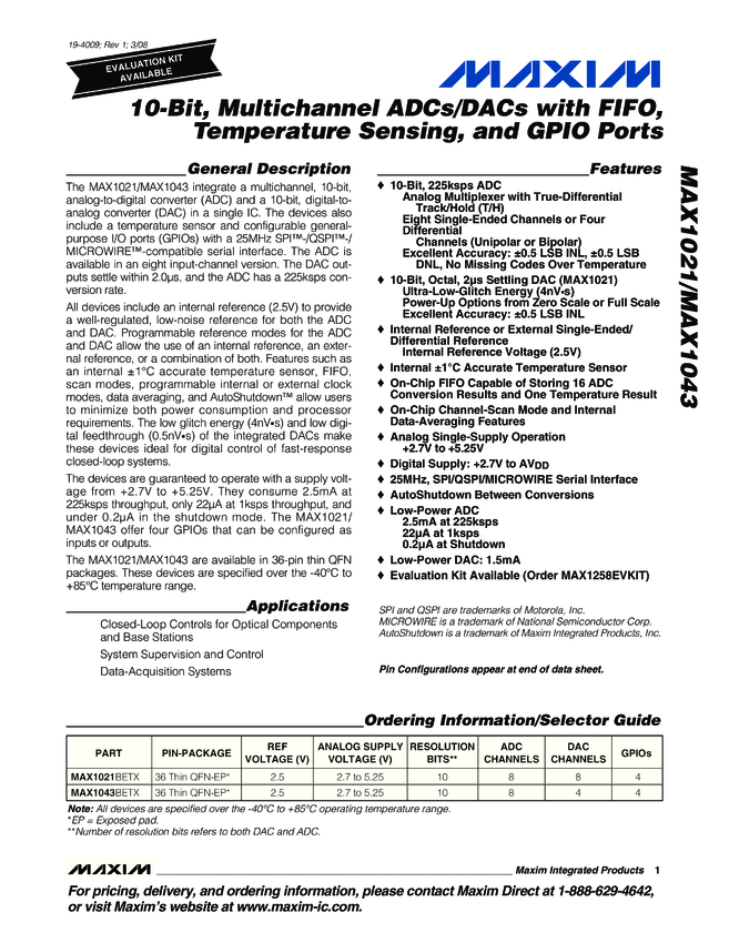 MAX1021, MAX1043 10-Bit, Multichannel ADCs/DACs with FIFO, Temperature Sensing, and GPIO Ports