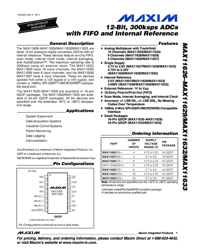 MAX11626, MAX11627, MAX11628, MAX11629, MAX11632, MAX11633 12-Bit, 300ksps ADCs with FIFO and Internal Reference