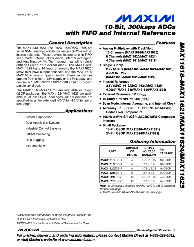 MAX11618, MAX11619, MAX11620, MAX11621, MAX11624, MAX11625 10-Bit, 300ksps ADCs with FIFO and Internal Reference
