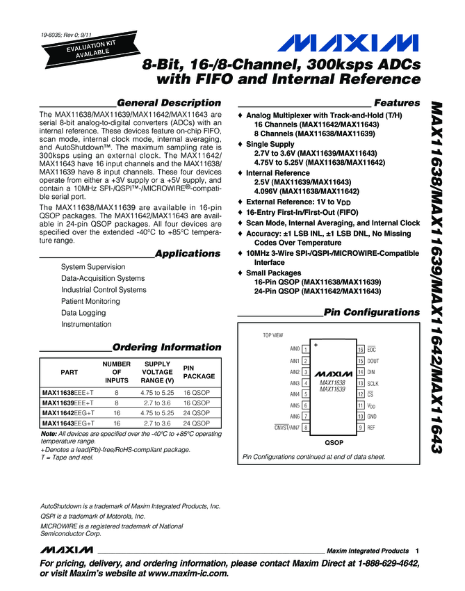 MAX11638, MAX11639, MAX11642, MAX11643 8-Bit, 16-/8-Channel, 300ksps ADCs with FIFO and Internal Reference