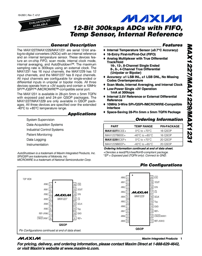 MAX1227, MAX1229, MAX1231 12-Bit 300ksps ADCs with FIFO, Temp Sensor, Internal Reference