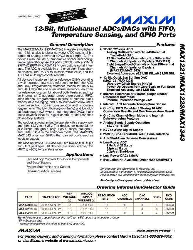 MAX1221, MAX1223, MAX1343 12-Bit, Multichannel ADCs/DACs with FIFO, Temperature Sensing, and GPIO Ports