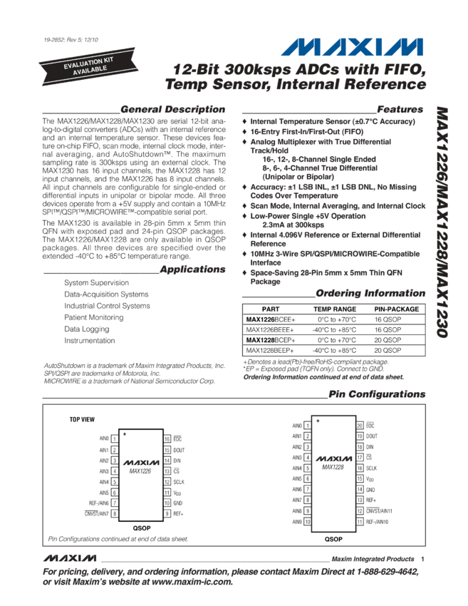 MAX1226, MAX1228, MAX1230 12-Bit 300ksps ADCs with FIFO, Temp Sensor, Internal Reference