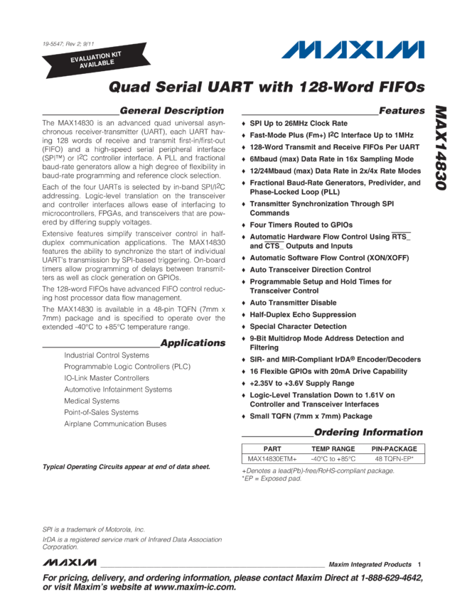 MAX14830 Quad Serial UART with 128-Word FIFOs