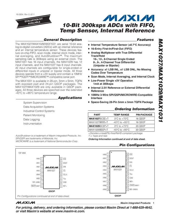 MAX1027, MAX1029, MAX1031 10-Bit 300ksps ADCs with FIFO, Temp Sensor, Internal Reference