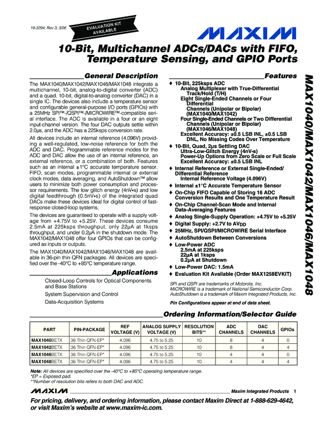 MAX1040, MAX1042, MAX1046, MAX1048 10-Bit, Multichannel ADCs/DACs with FIFO, Temperature Sensing, and GPIO Ports