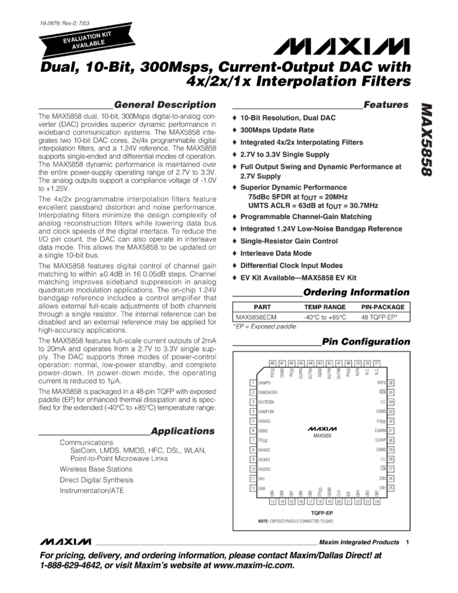 MAX5858 Dual, 10-Bit, 300Msps, Current-Output DAC with 4x/2x/1x Interpolation Filters
