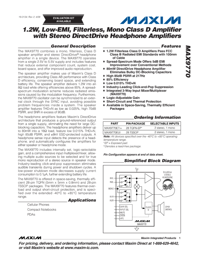 MAX9770 1.2W, Low-EMI, Filterless, Mono Class D Amplifier with Stereo DirectDrive Headphone Amplifiers