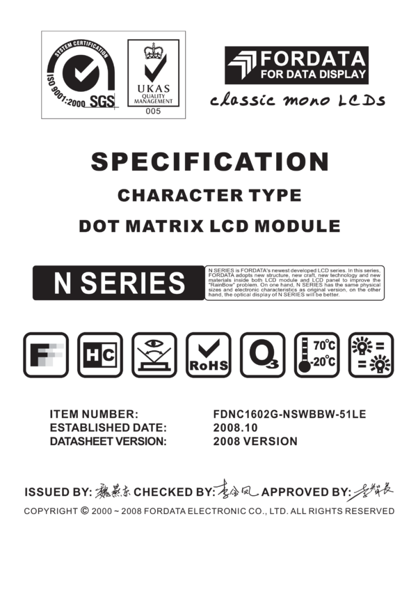 Matryca 20x2 znaków, negatywowa, podświetlenie LED żółto-zielone, FSTN, z filtrem UV, 12:00, -20/+70C, ekran , Font English-, FORDATA [FDNC2002D-NLYFTW-51LR]