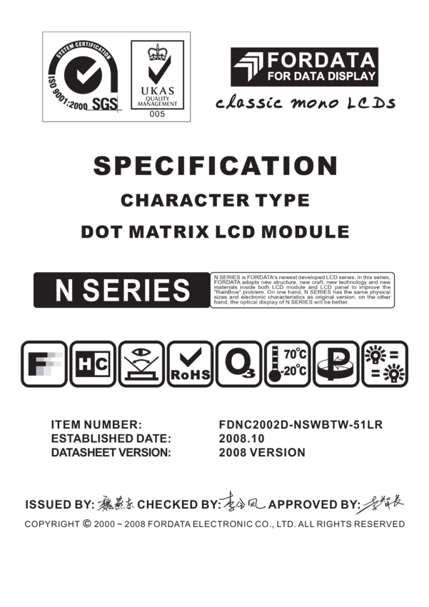 Matryca 20x2 znaków, pozytywowa, podświetlenie LED białe, FSTN, z filtrem UV, 06:00, -20/+70C, ekran , Font English-Japanese, FORDATA [ FDCC2002D-FSWFBW-51LE]
