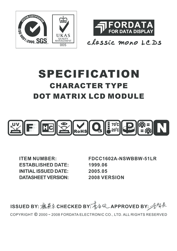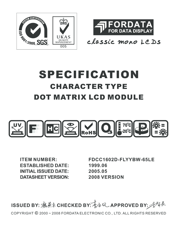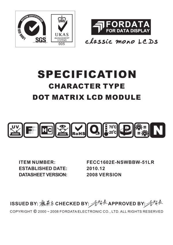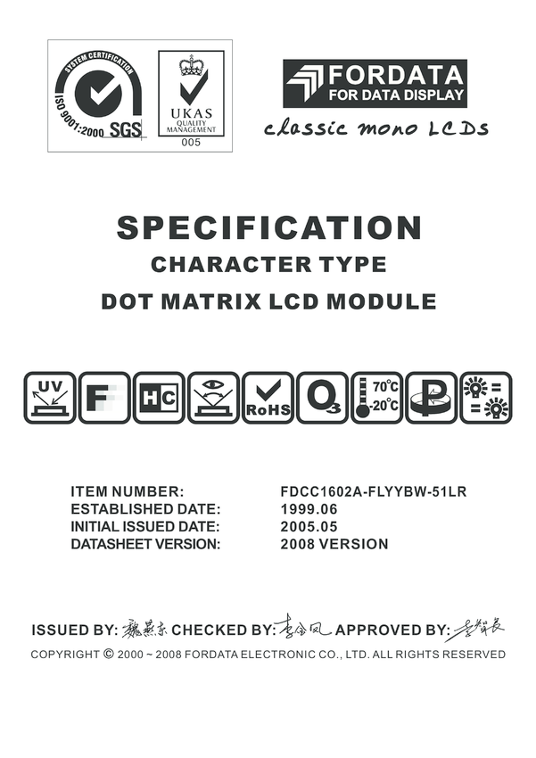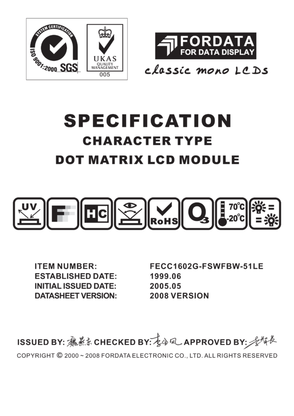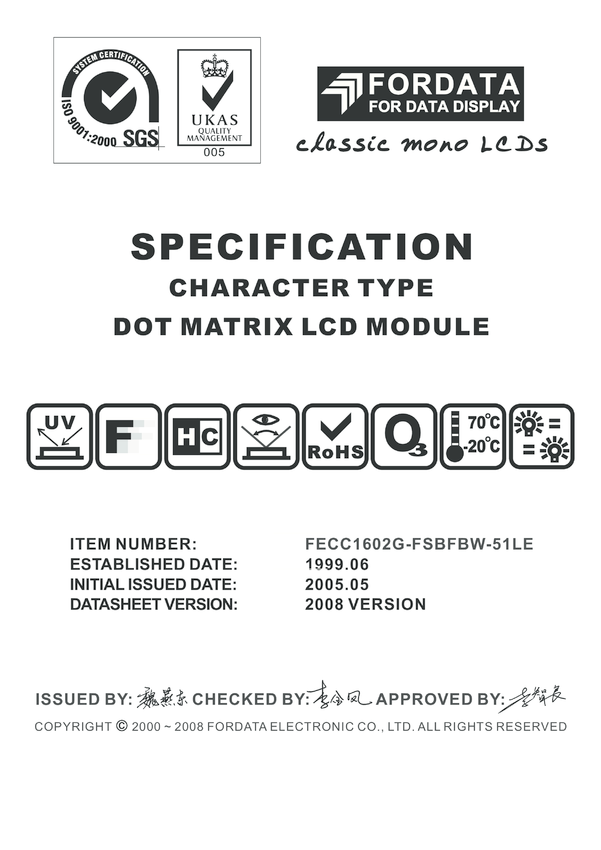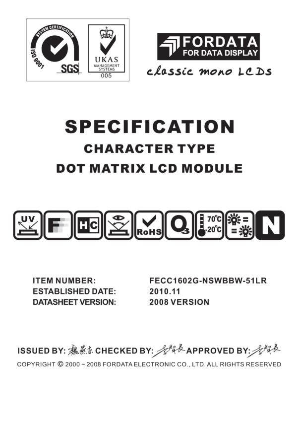 Matryca 16x2 znaków, pozytywowa, podświetlenie , z filtrem UV, 06:00, -20/+70C, ekran , Font English-, FORDATA [FECC1602G-FLAYBW-51LR]