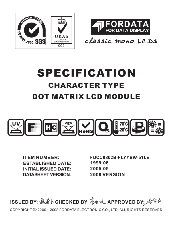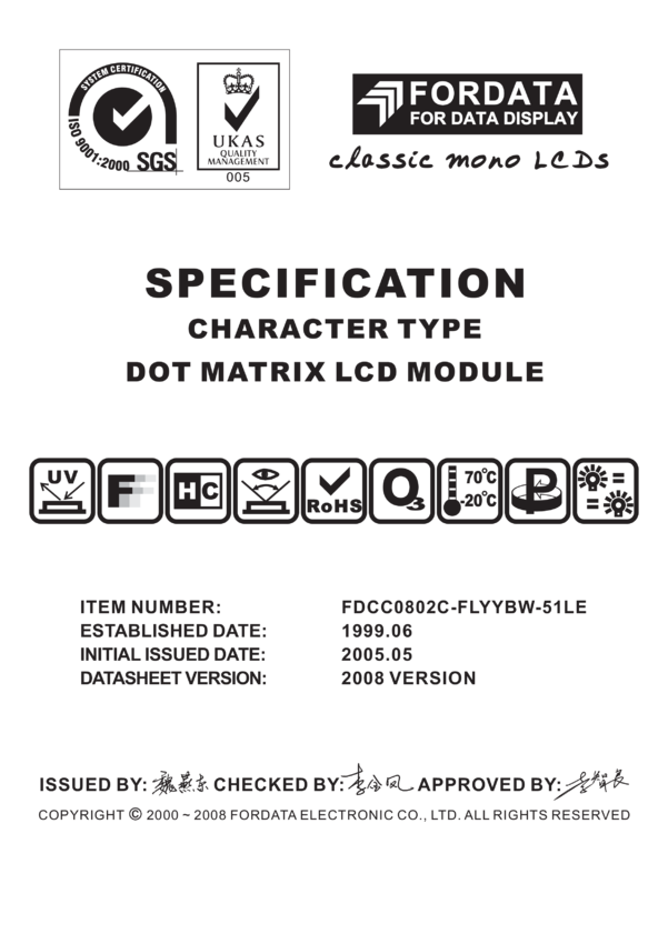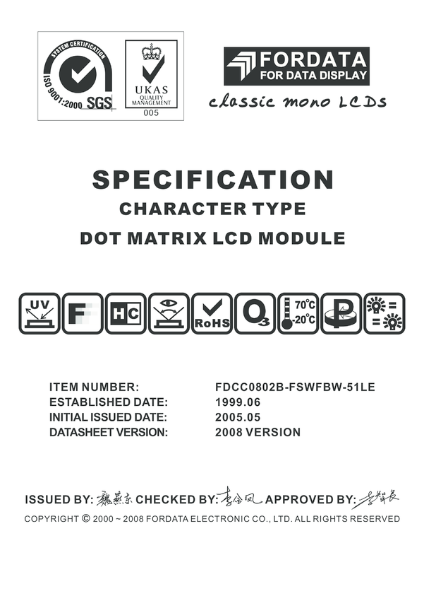 Matryca 8x2znaków, pozytywowa, z podświetleniem , z filtrem UV, 6:00, -20/+70C, ekran , Font English-, FORDATA [FDCC0802B-FSWFBW-51LR]