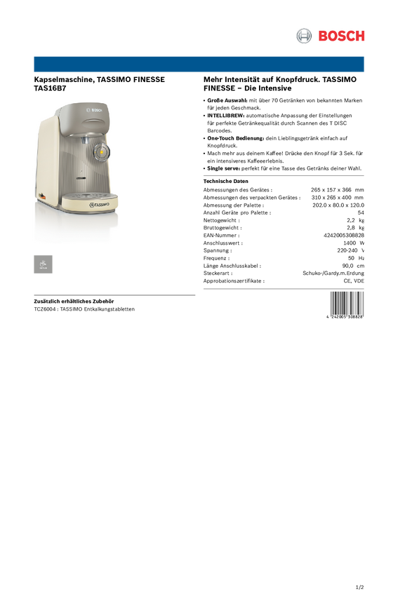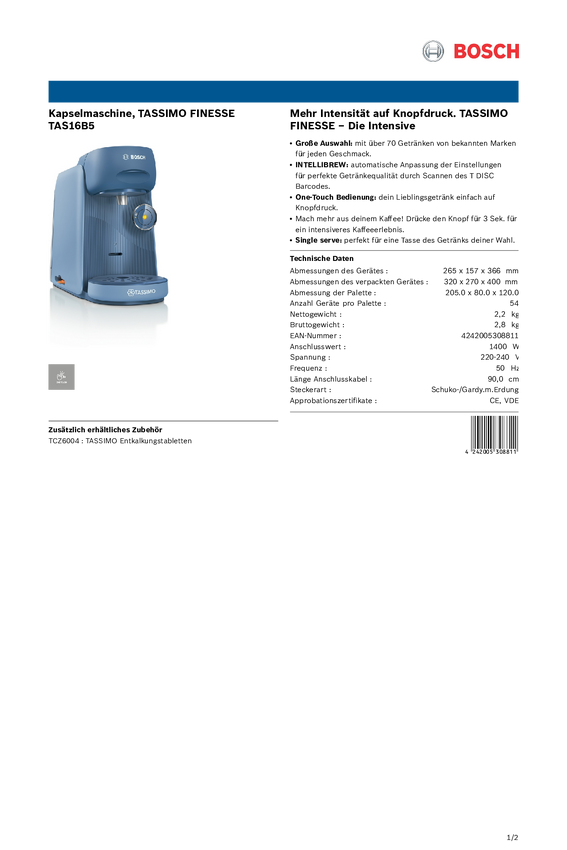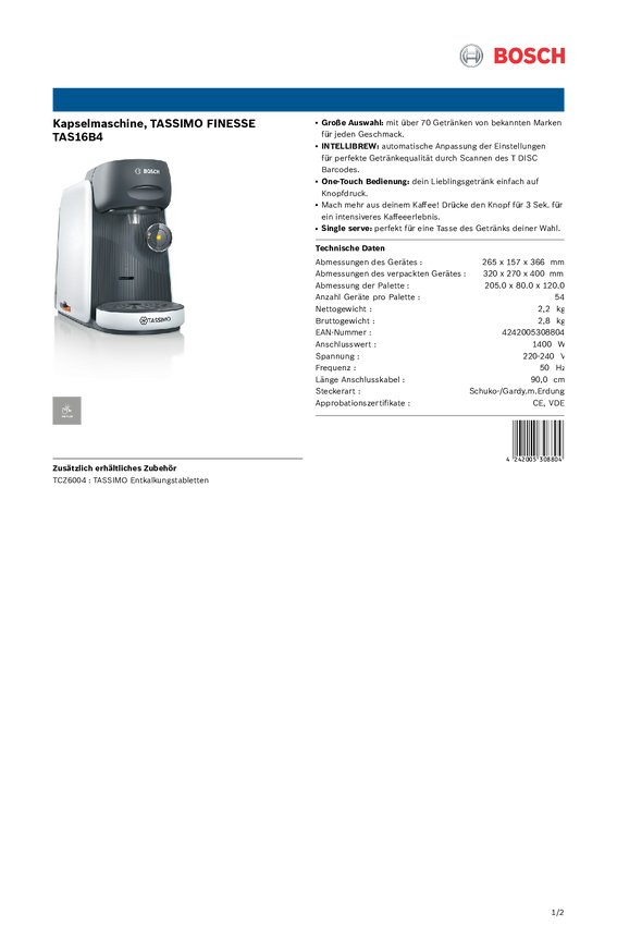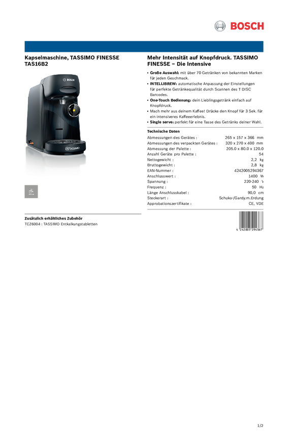 Bosch Haushalt FINESSE TAS16B2 Ekspres do kawy na kapsułki czarny