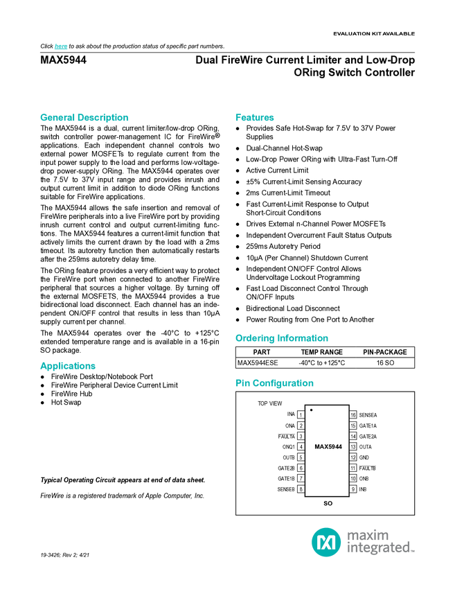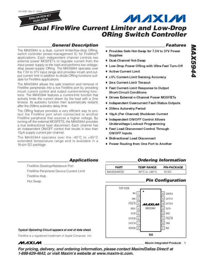 MAX5944 Dual FireWire Current Limiter and Low-Drop ORing Switch Controller