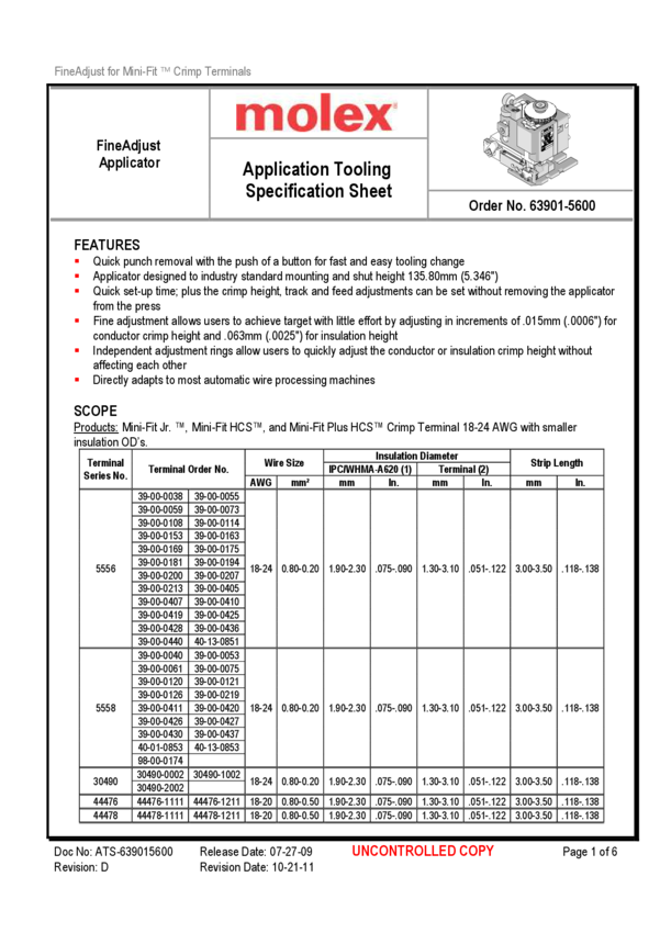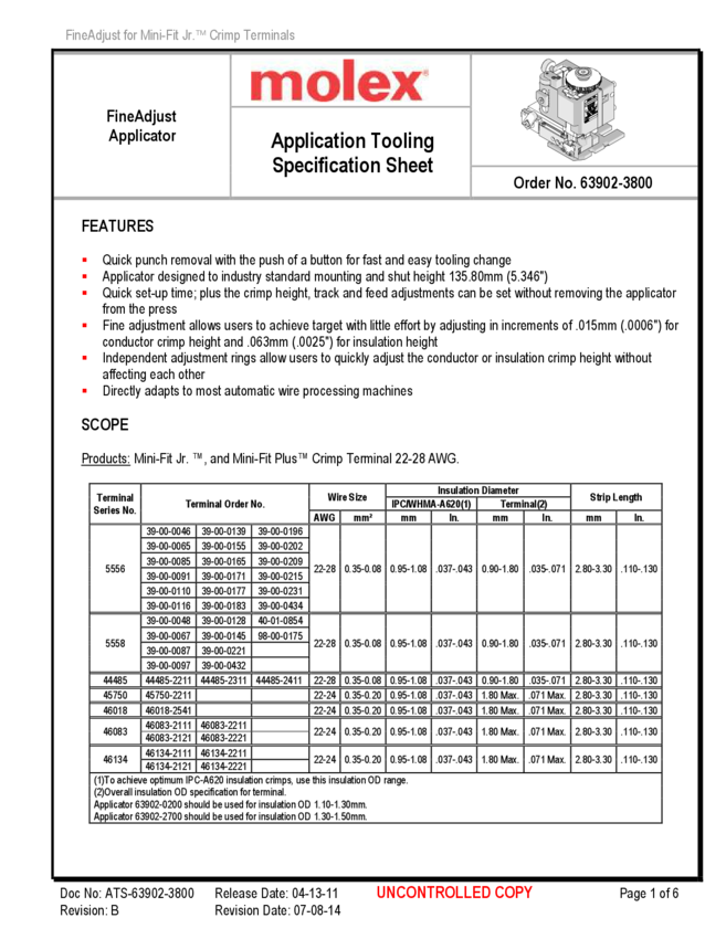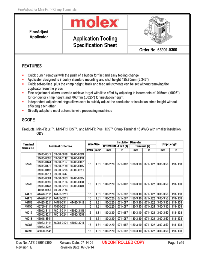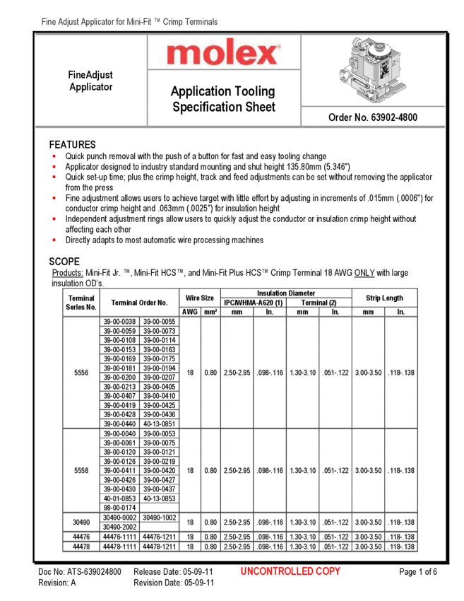 FineAdjust Applicator for Mini-Fit Jr. and Mini-Fit Plus Crimp Terminals