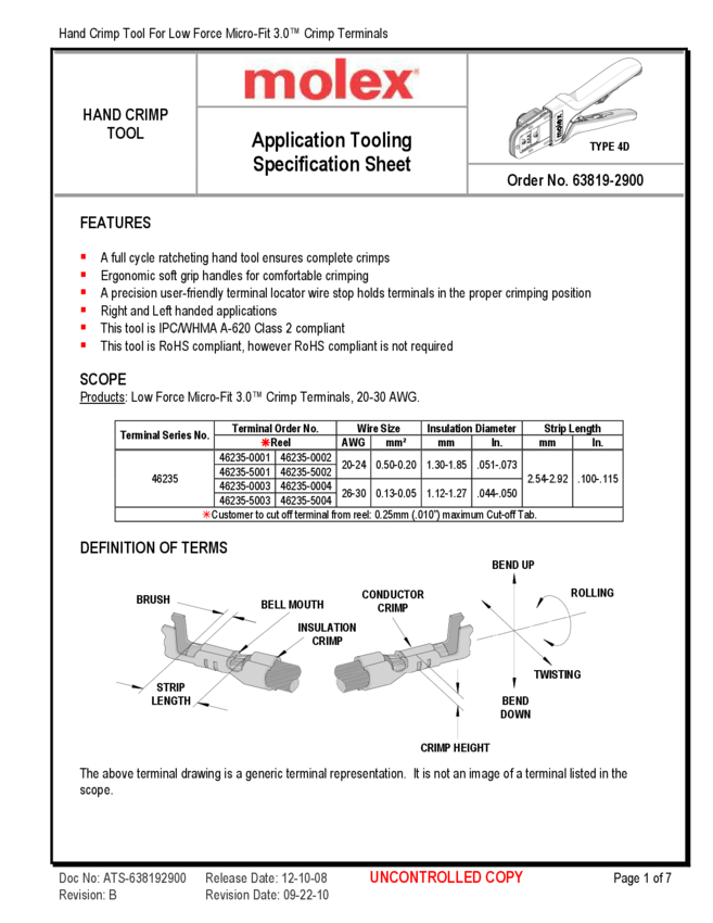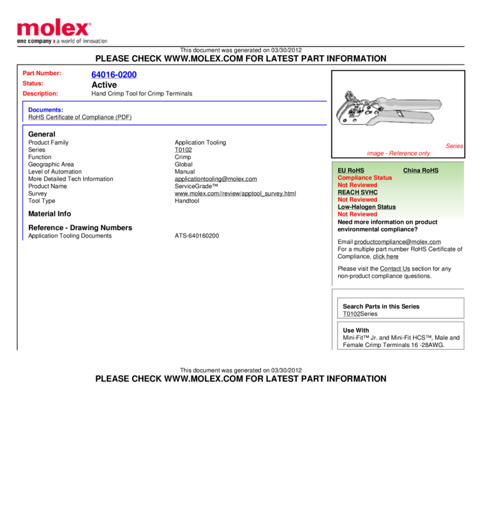 Hand Crimp Tool For Mini-Fit Jr. and Mini-Fit HCS Crimp Terminal