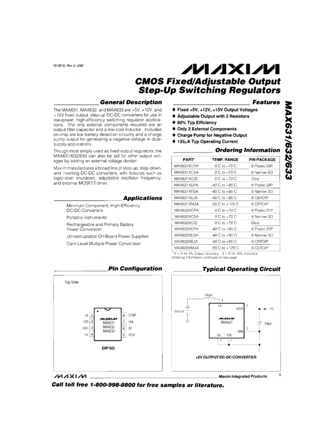 MAX631, MAX632, MAX633 5V Fixed/Adjustable Output, Step-Up Switching Regulators
