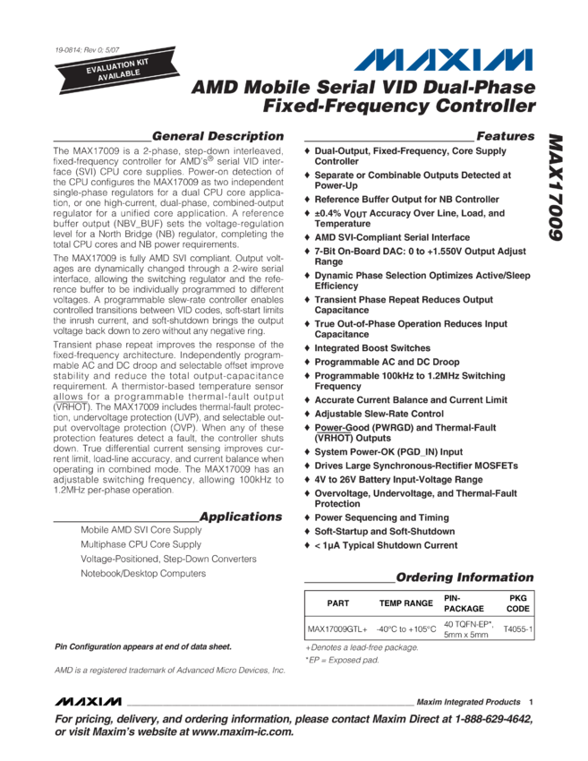 MAX17009 AMD Mobile Serial VID Dual-Phase Fixed-Frequency Controller