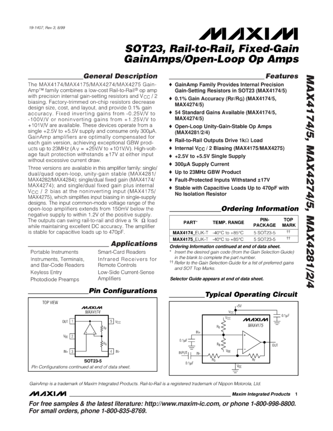 MAX4174, MAX4175, MAX4274, MAX4275, MAX4281, MAX4282, MAX4284 SOT23, Rail-to-Rail, Fixed-Gain GainAmps/Open-Loop Op Amps