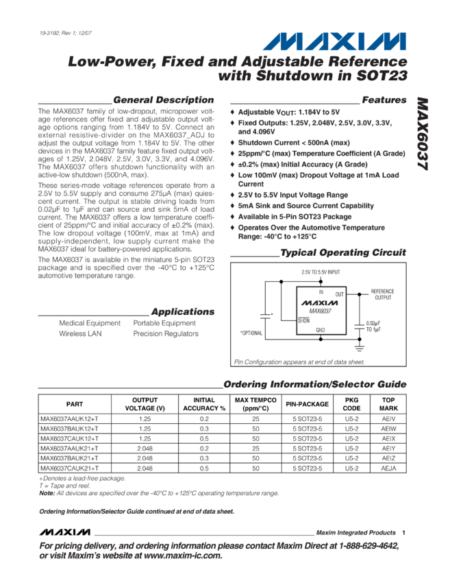 MAX6037 Low-Power, Fixed and Adjustable Reference with Shutdown in SOT23