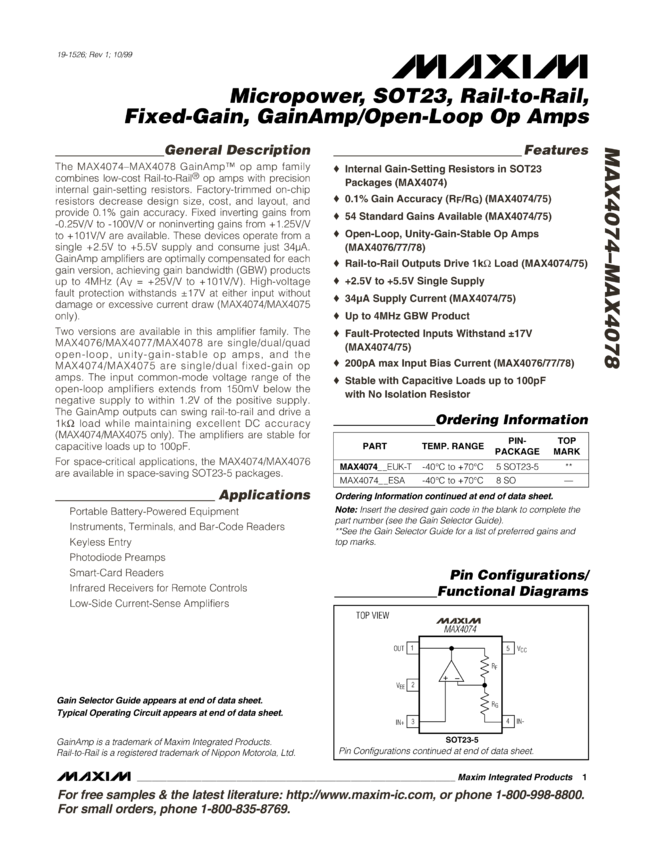 MAX4074, MAX4075, MAX4076, MAX4077, MAX4078 Micropower, SOT23, Rail-to-Rail, Fixed-Gain GainAmp/Open-Loop Op Amps