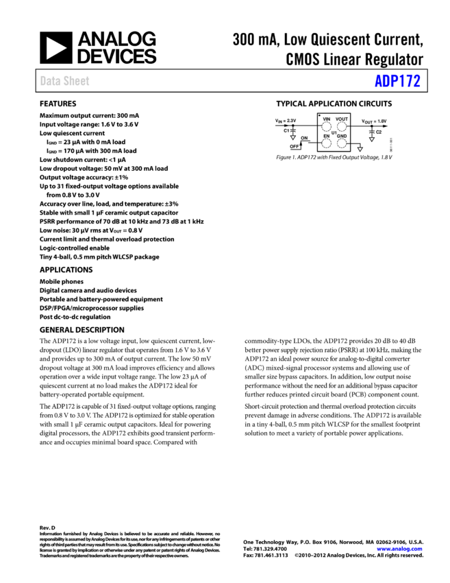 ADP172: 300 mA, Low Quiescent Current, fixed-output, CMOS Linear Regulator in a WLCSP footprint