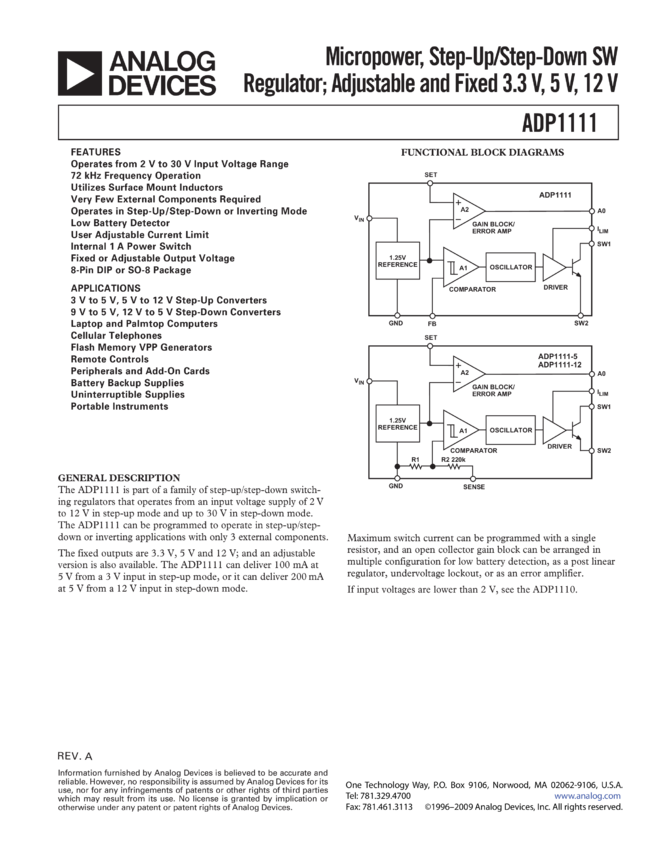 ADP1111: Micropower, Step-Up/Step-Down SW Regulator; Adjustable and Fixed 3.3 V, 5 V, 12 V