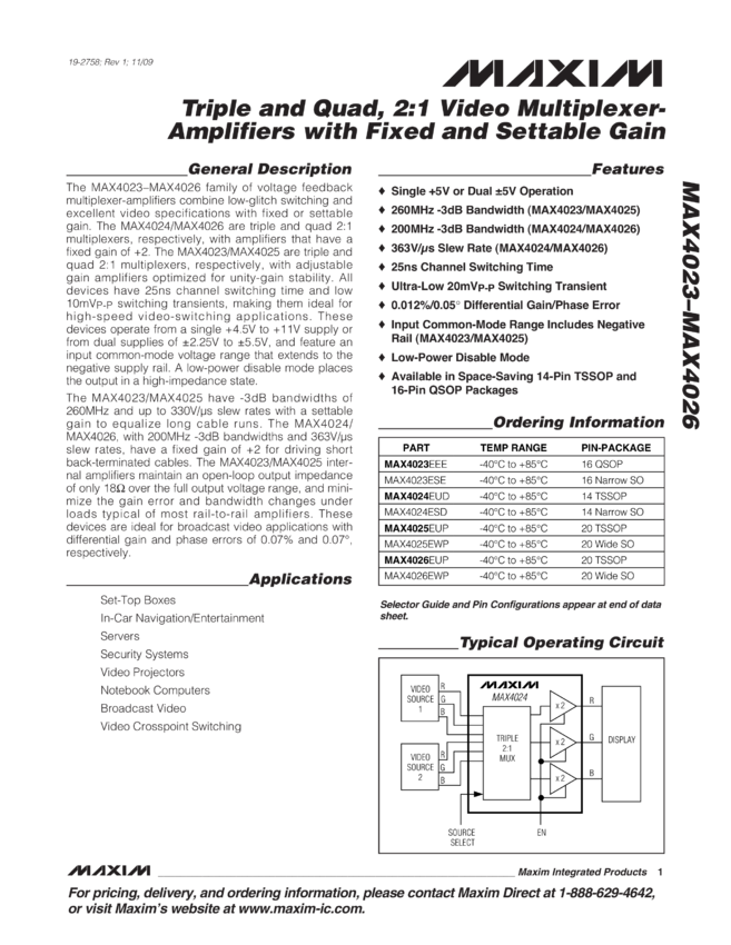 MAX4023, MAX4024, MAX4025, MAX4026 Triple and Quad, 2:1 Video Multiplexer-Amplifiers with Fixed and Settable Gain