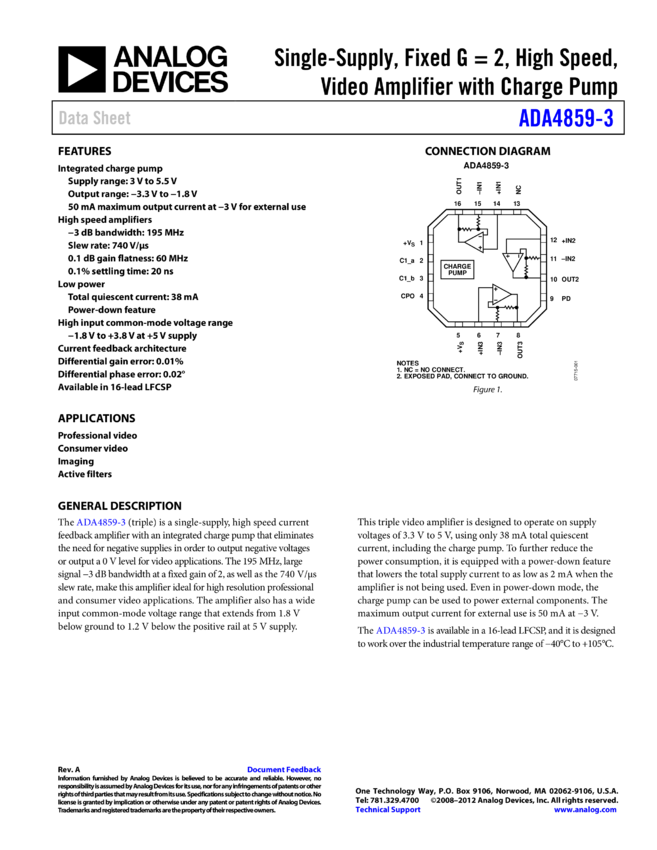 ADA4859-3: Single-Supply, Fixed G = 2, High Speed, Video Amplifier with Charge Pump