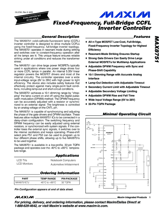 MAX8751 Fixed-Frequency, Full-Bridge CCFL Inverter Controller