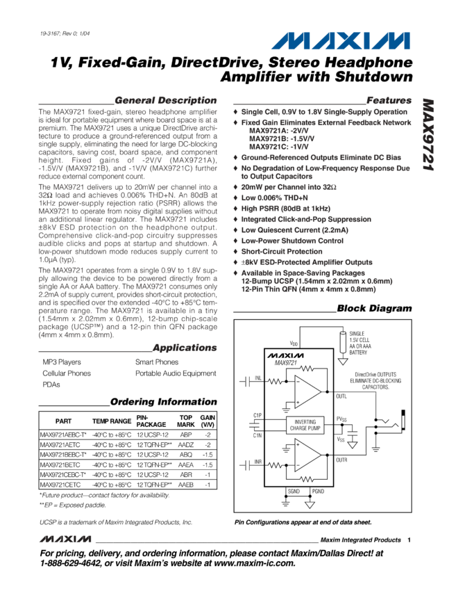 MAX9721 1V, Fixed-Gain, DirectDrive®, Stereo Headphone Amplifier with Shutdown