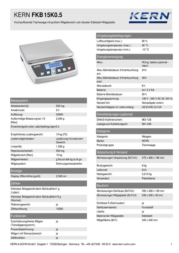 Kern FKB 15K0.5 Waga stołowa Zakres pomiaru maks. 15 kg Podziałka 500 mg z sieci elektrycznej srebrny, biały, czarny