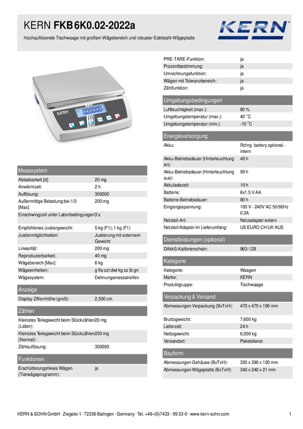 Kern FKB 6K0.02 Waga stołowa Zakres pomiaru maks. 6 kg Podziałka 20 mg z sieci elektrycznej srebrny, biały, czarny