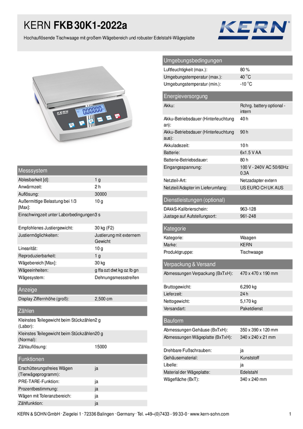 Kern FKB 30K1 Waga stołowa Zakres pomiaru maks. 30 kg Podziałka 1 g z sieci elektrycznej srebrny, biały, czarny